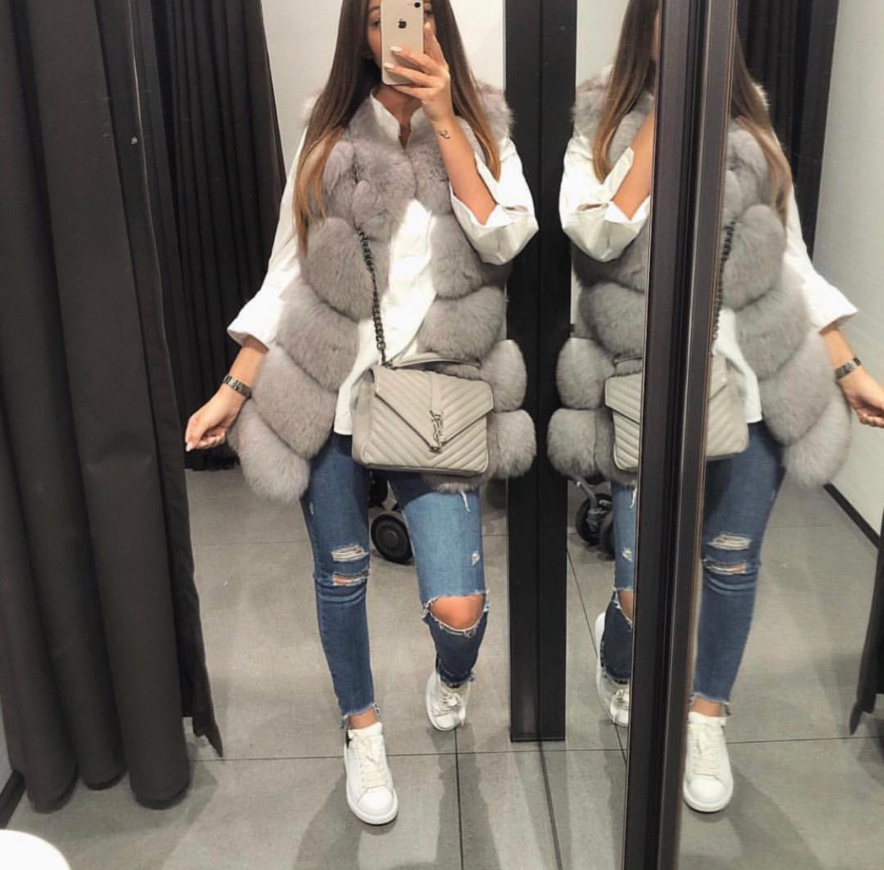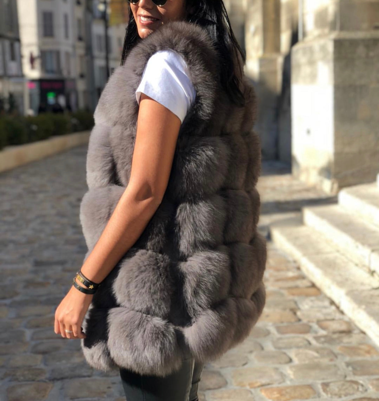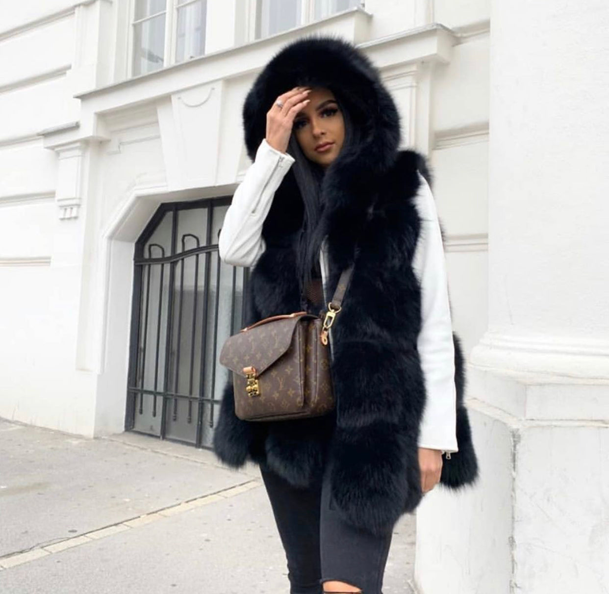 Our popular Fox Fur Vest with Oversized Plush Hood.