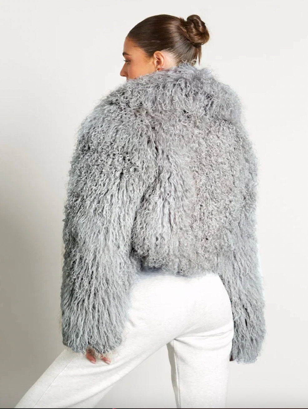 A cropped Mongolian lamb fur jacket designed to turn heads. Featuring ultra-soft, curly texture and a plush, lightweight feel, this statement piece adds instant glam to any outfit. The cropped silhouette flatters the waist while delivering cozy warmth with effortless elegance. This is the IT GIRL Jacket of the year.